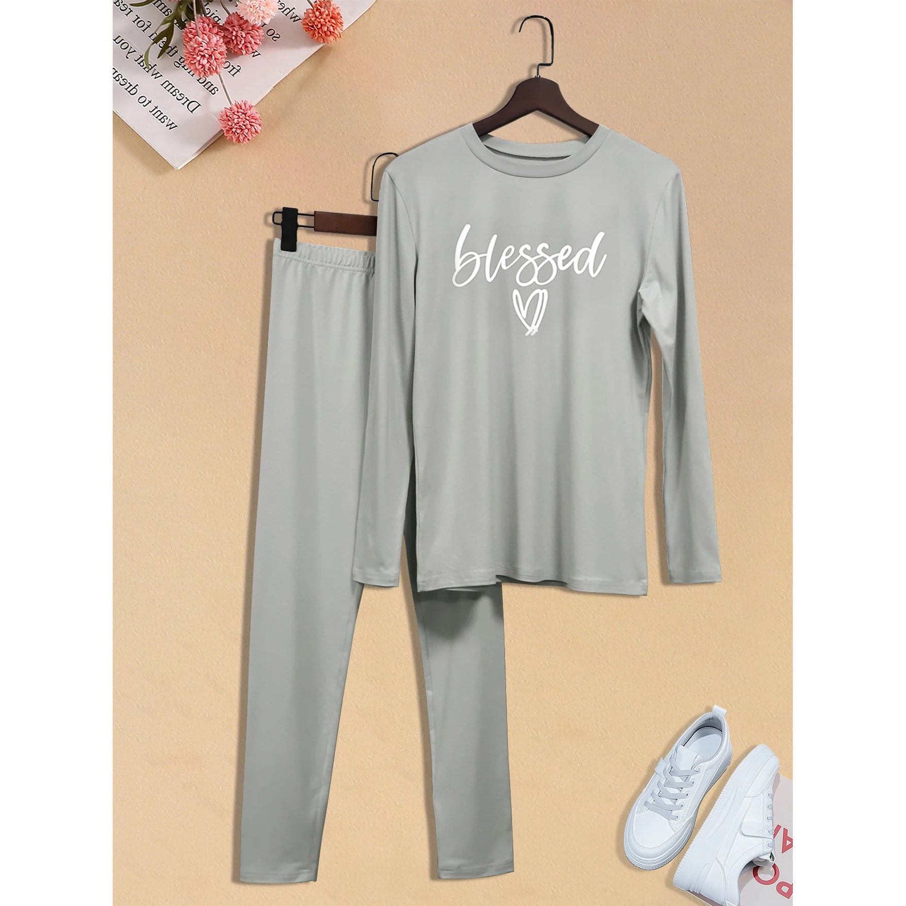Features: Blessing letter print, pullover t-shirt design, round neck long sleeves, slim fit, plus size, sexy long leg pants, solid color, basic style never goes out of style, women's two-piece set.